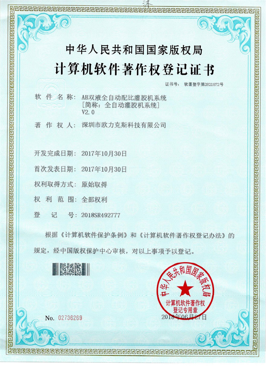 AB雙液全自動配比91短视频成人网站在线观看係統V1.0登記證書